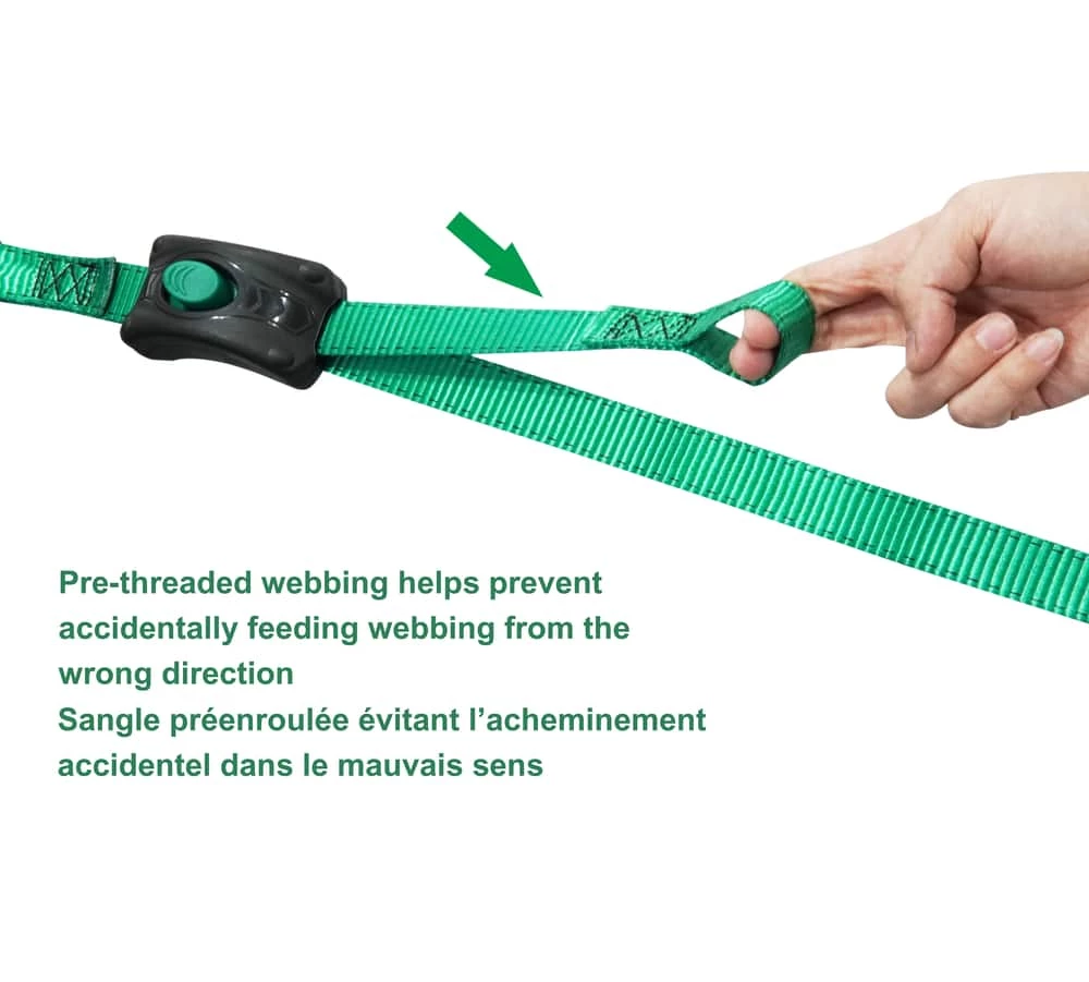 - Pre-threaded webbing helps prevent accidentally feeding webbing from the wrong direction