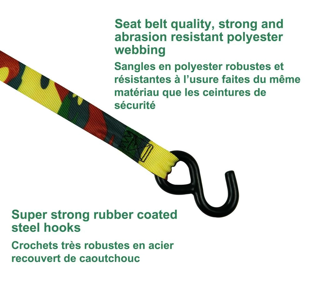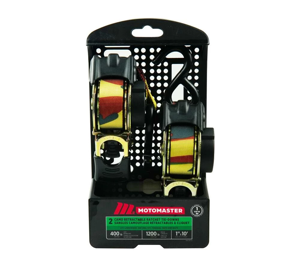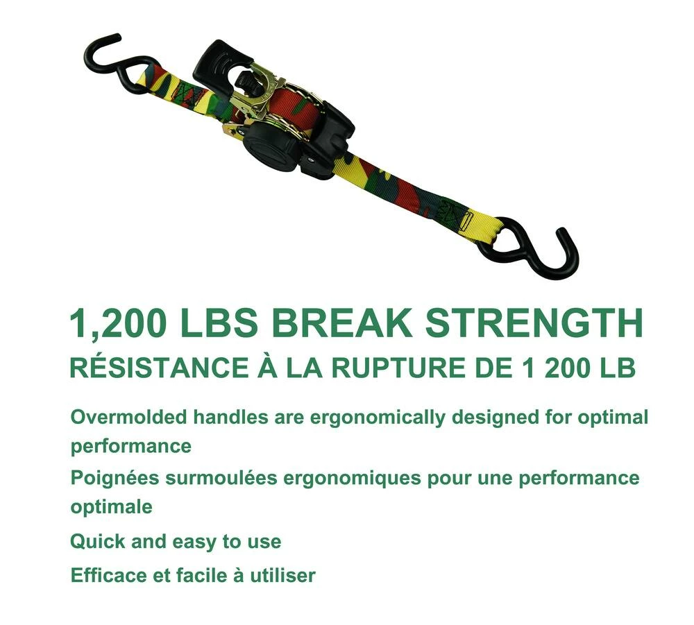 - Retractable Camo Tie Down features 1,200-lb break strength and 400-lb safe work load