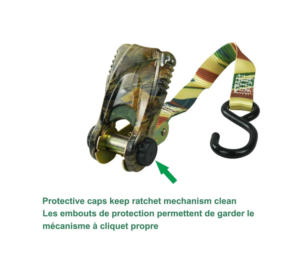 - Camo Ratchet Tie Down features a 1500-lb (680.4 kg) break strength and 500-lb (226.8 kg) safe work load