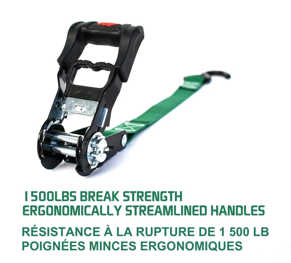 - Padded Oversized D-Handle Ratchet Tie Downs have a 680 kg (1,500 lbs) break strength