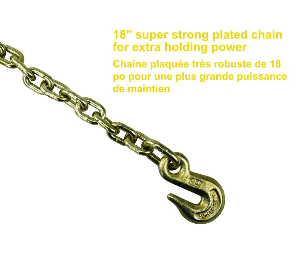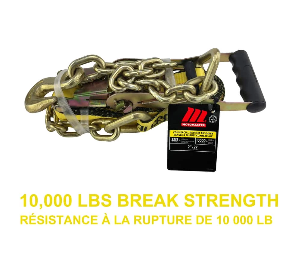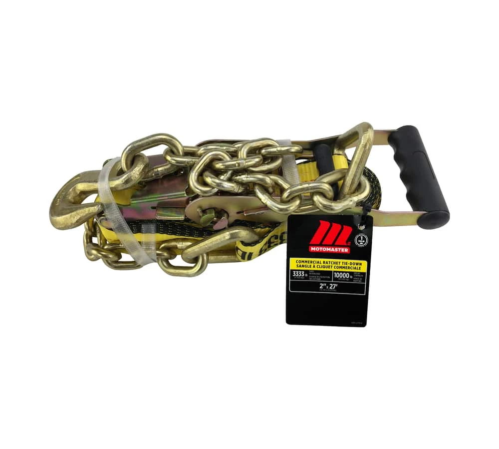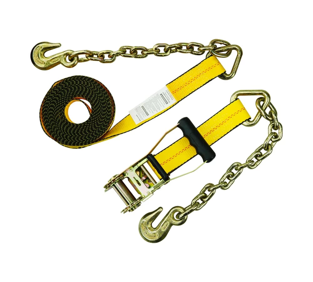- Ratchet Tie Down is 2″ (5 cm) thick and 27′ (8.2 m) long, and features an 18″ (45.7 cm) chain