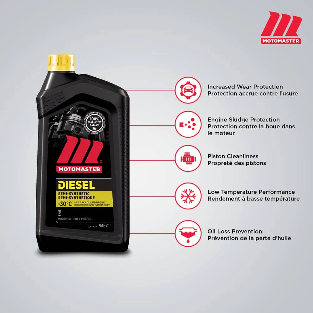 - MotoMaster 10W30 Semi-Synthetic Diesel Engine Oil features synthetic blend premium base oils combined with advanced additive technology can provide optimized engine oil change intervals when following engine manufacturer service recommendations