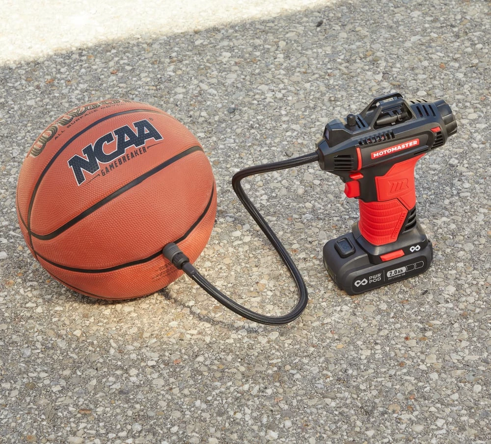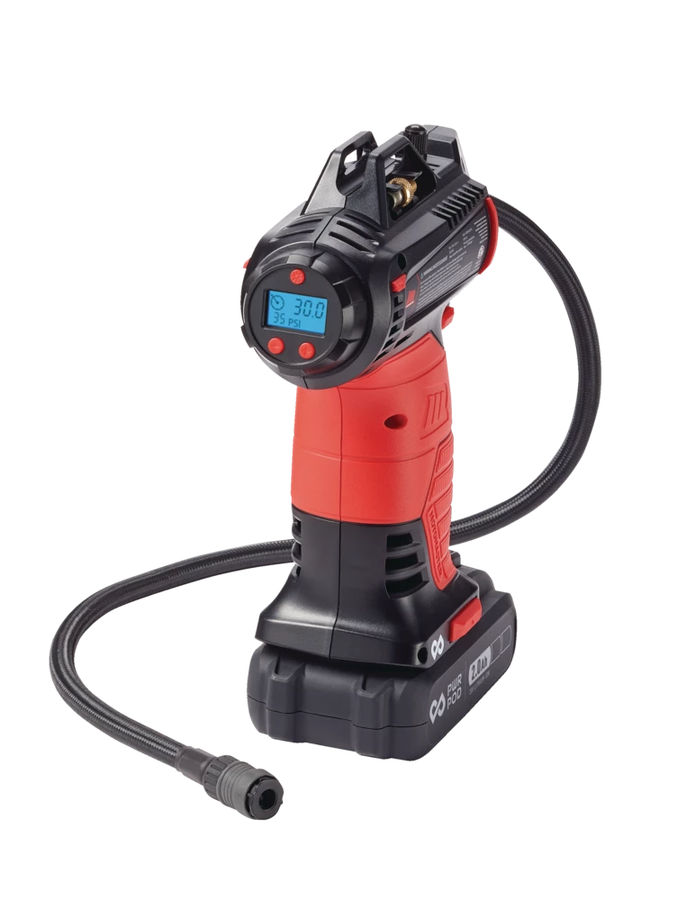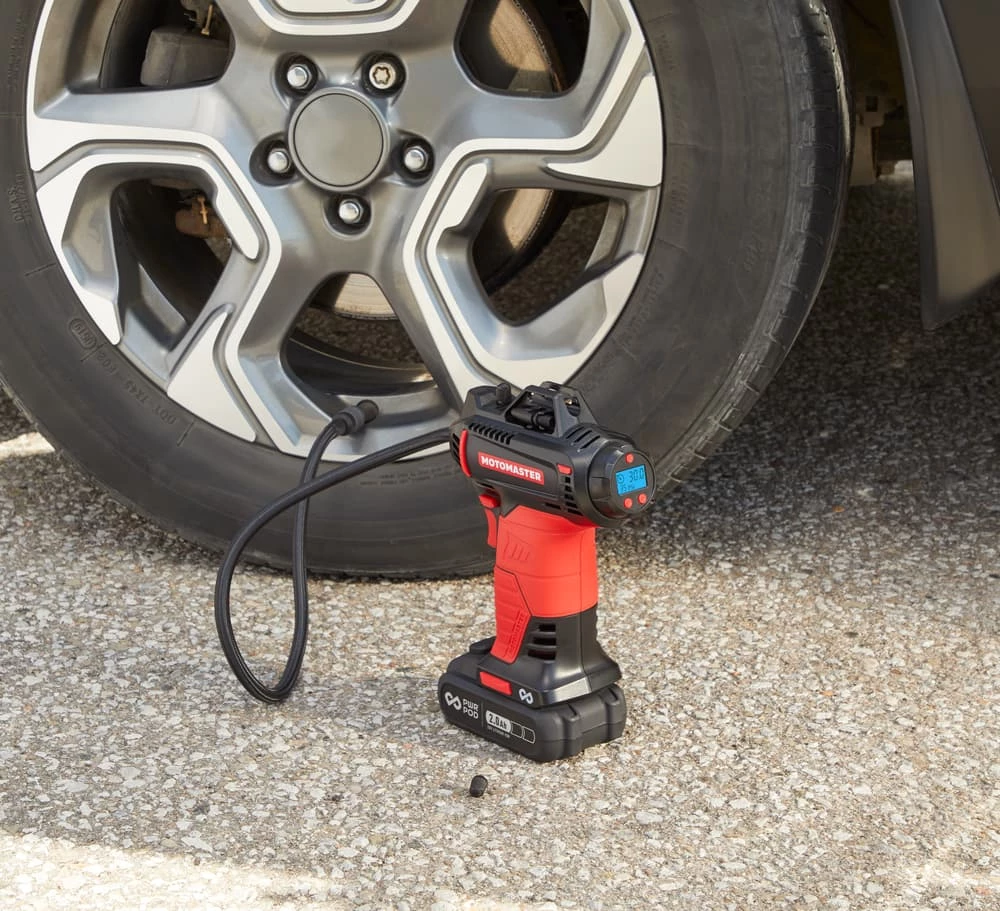 - Motomaster Digital Portable Tire Inflator is powered by PWR POD 20V 2.0Ah compact battery that can be used across other PWR POD compatible products