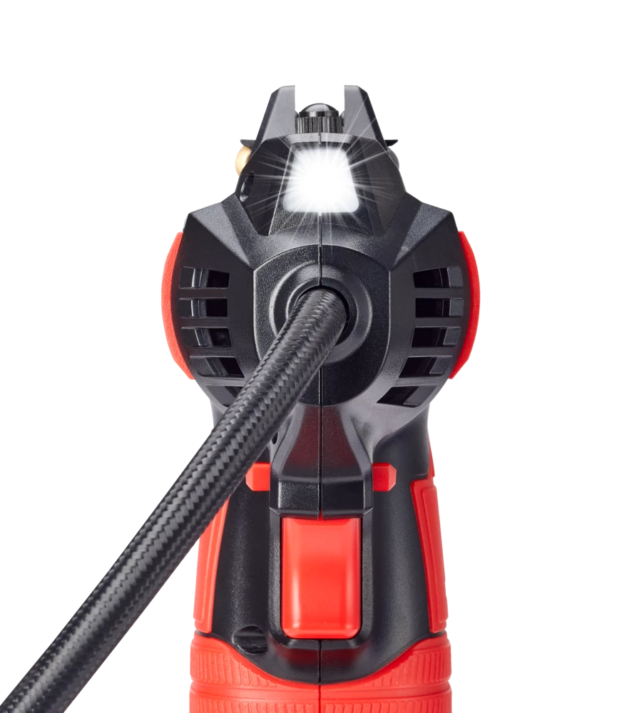 - Backlit digital display panel reads actual tire pressure and pre-set air pressure