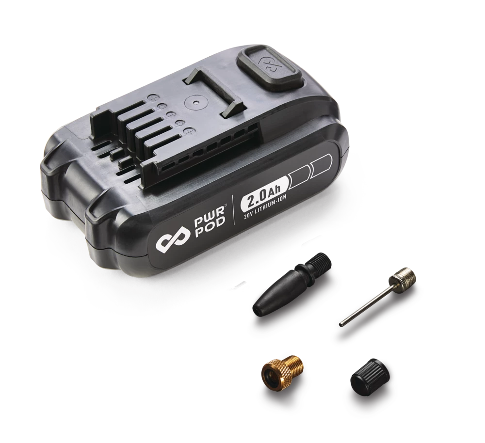 - Accessories Included: (1) Presta valve adaptor, (1) pinch valve adaptor, (1) inflation needle, (1) PWR POD 2.0 Ah lithium-ion battery, (1) PWR POD 10W charger