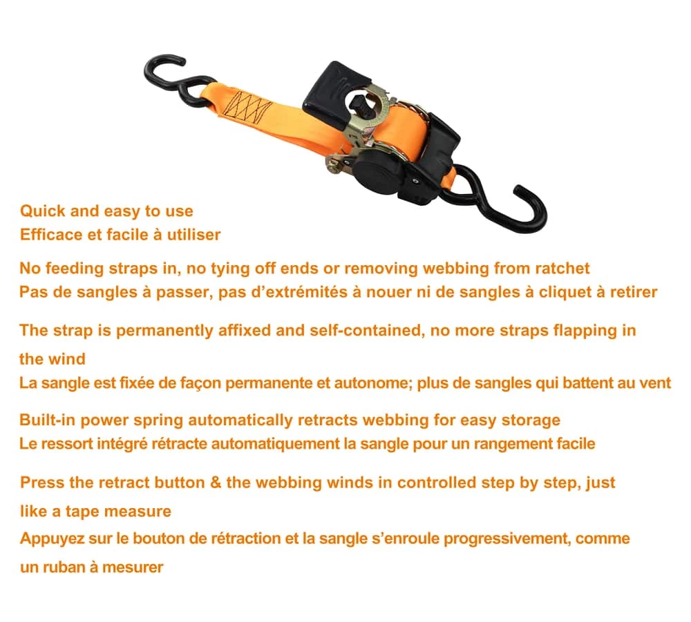 - 2″ x 10′ strap with built-in power spring automatically retracts webbing for easy use and storage