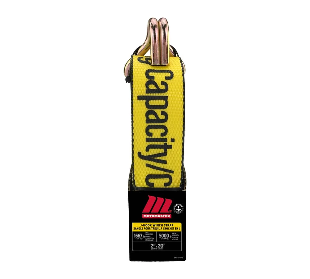 - Winch Strap with J Hook is 2″ thick and 20′ long, and features a J Hook