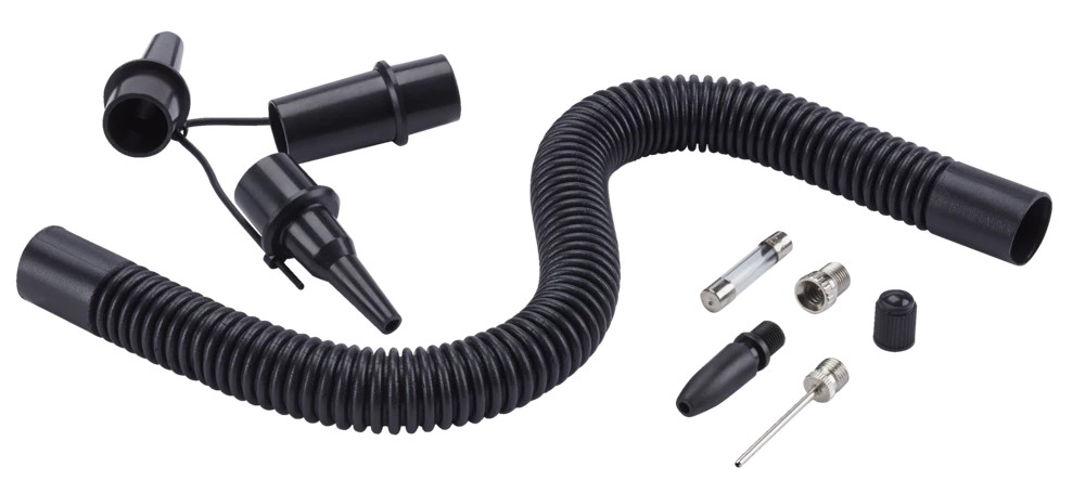 - Accessories Included: (1) inflation nozzle for inflatable toys, (1) inflation needle for sporting equipment, (1) Schrader to Presta valve adaptor, (1) spare valve stem cap, (1) boston valve, (1) small boston Valve, (1) pinch valve to inflate high-volume objects (mattresses, pool floatation devices, etc.) and (1) 15A spare fuse