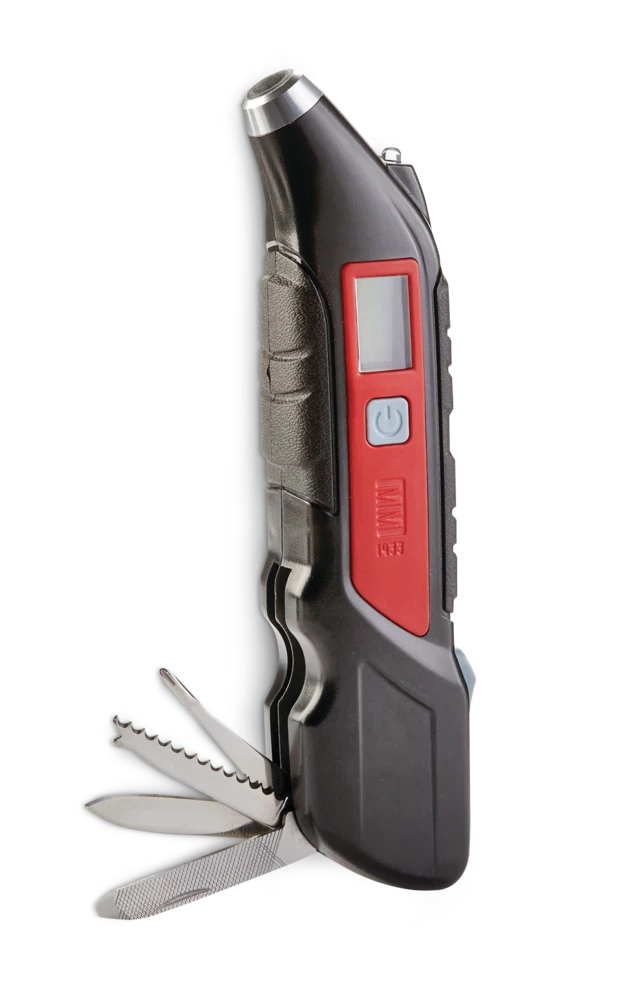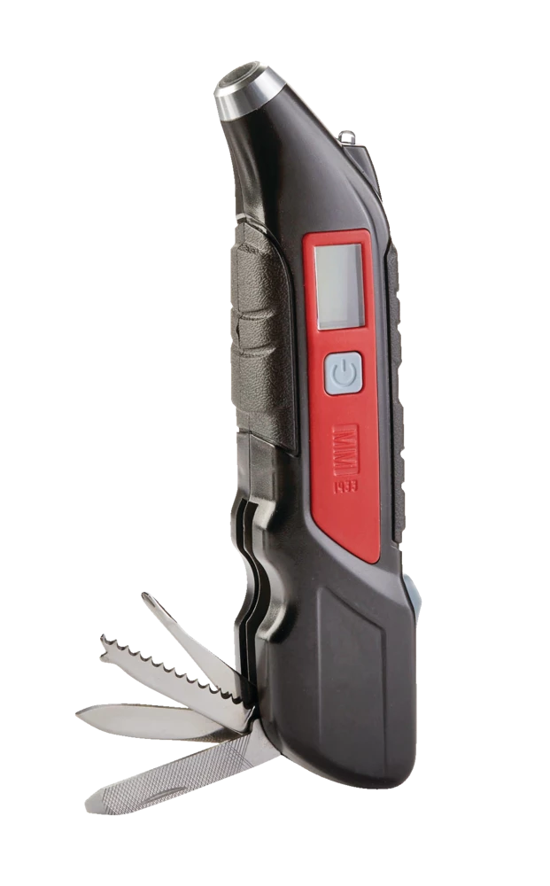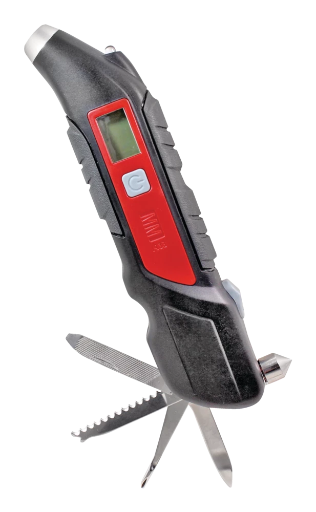 - MotoMaster Digital Tire Gauge with Multi-Function 5-99 PSI features a built-in stainless steel multi-tool for added convenience