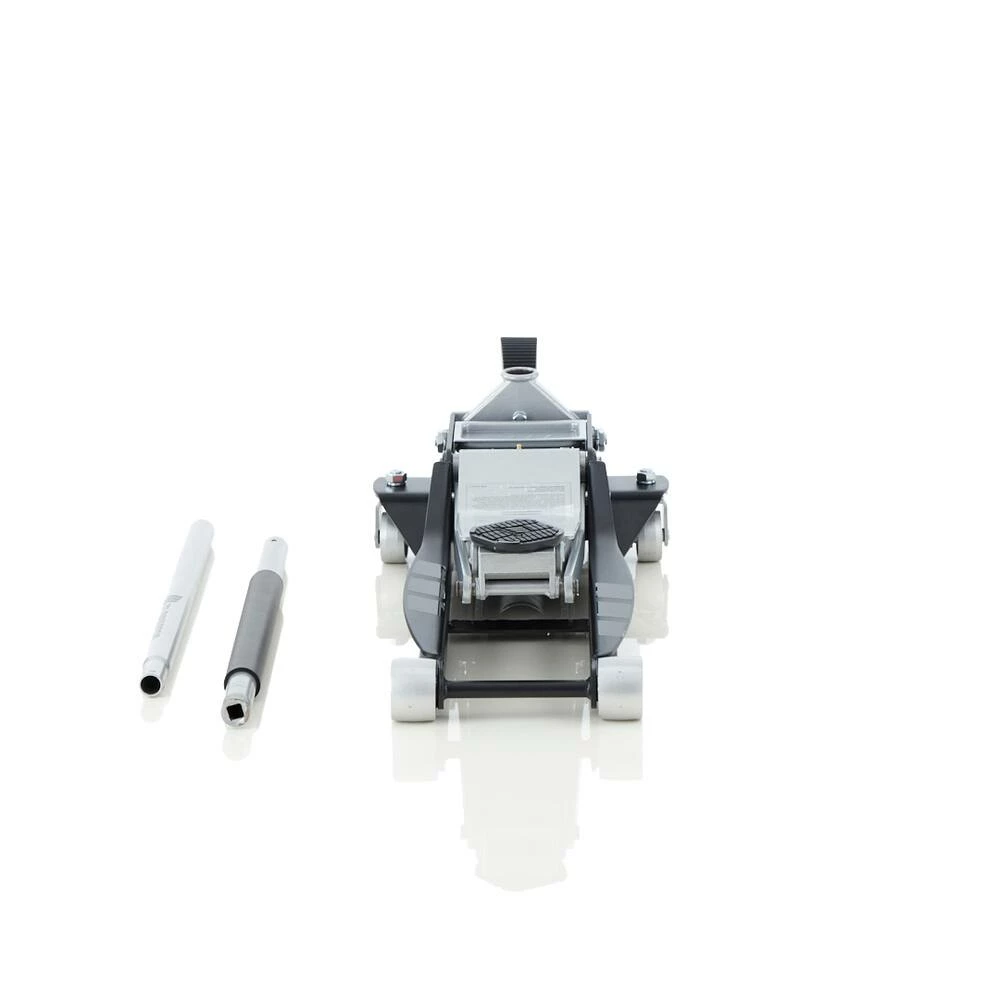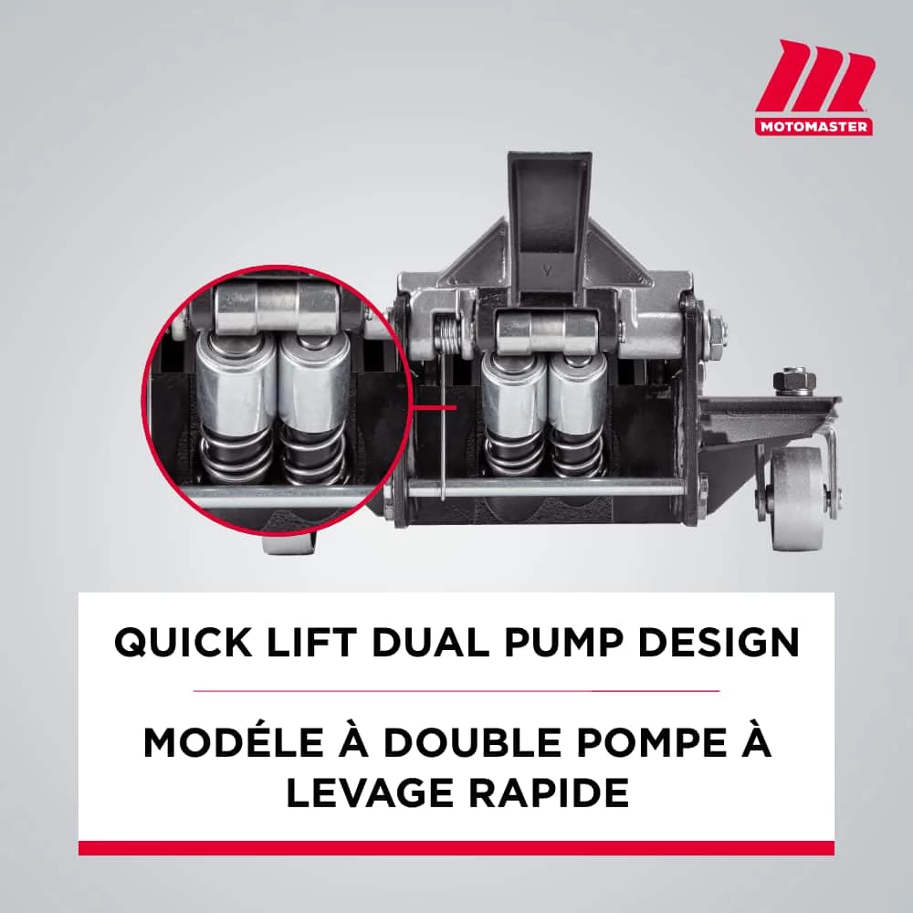 The MotoMaster Eliminator 3-Ton Heavy-Duty Low Profile Long Reach Garage Jack is proven to last up to 3,000 lift cycles with the help of upgraded polyurethane piston seals that last longer than conventional seals and helps to prevent leaks. This versatile jack can be used on sports cars and other low profile cars, passenger cars, SUV/Vans and light trucks. Able to easily lift up to 6,000-lbs and has lift range between 3.25 and 24 in. Also features a dual pump design for a quick lift to reach maximum height in fewer pump strokes.