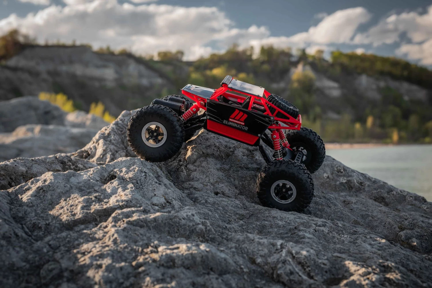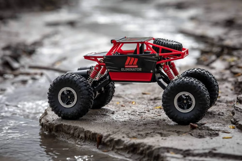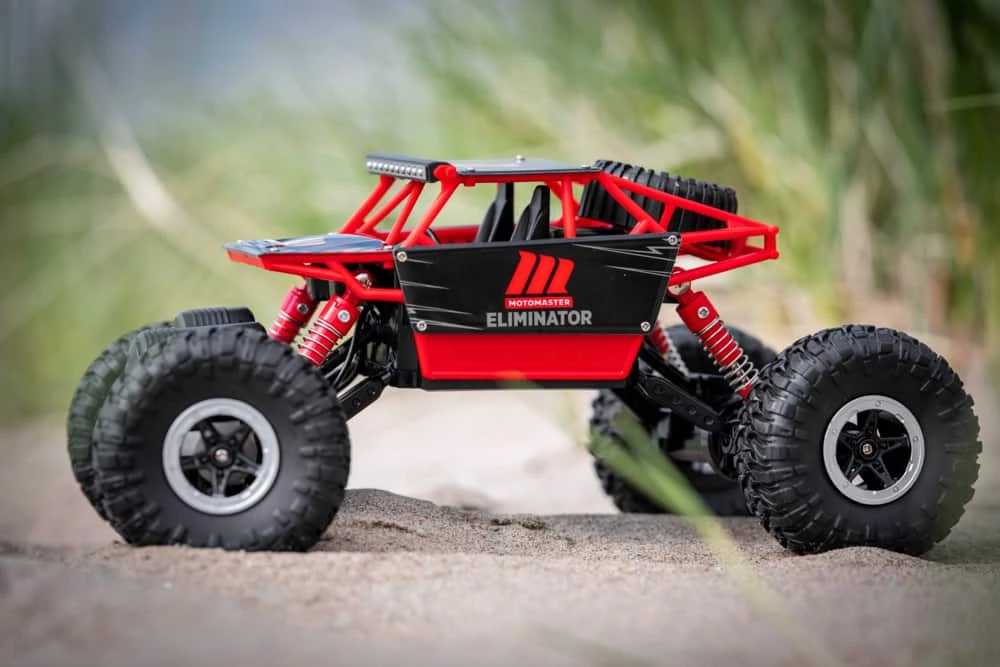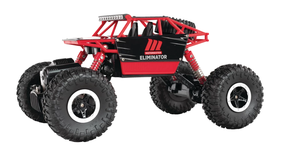 - MotoMaster Eliminator Rock Racer features oversized wheels with a high travel suspension to easily navigate through rough terrain