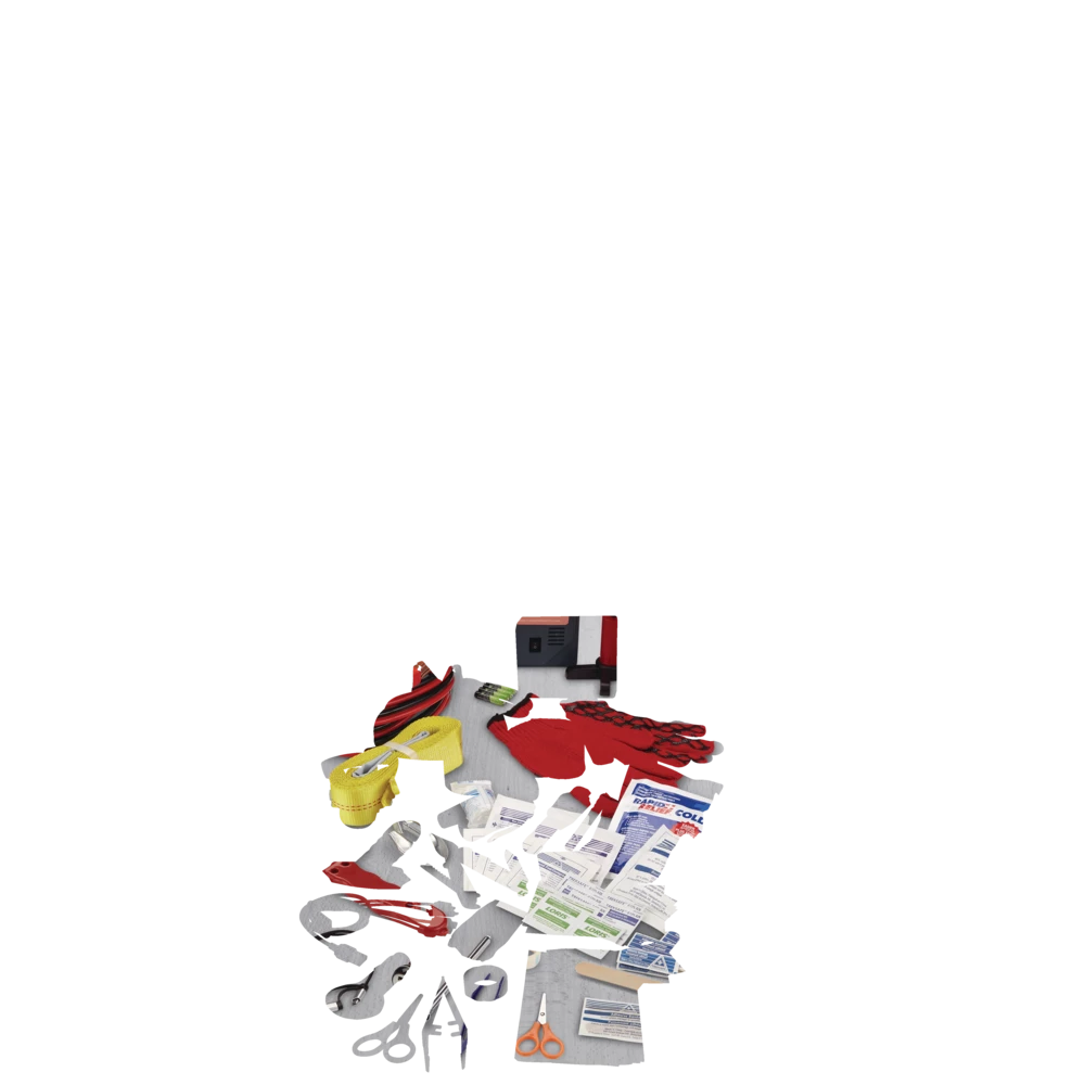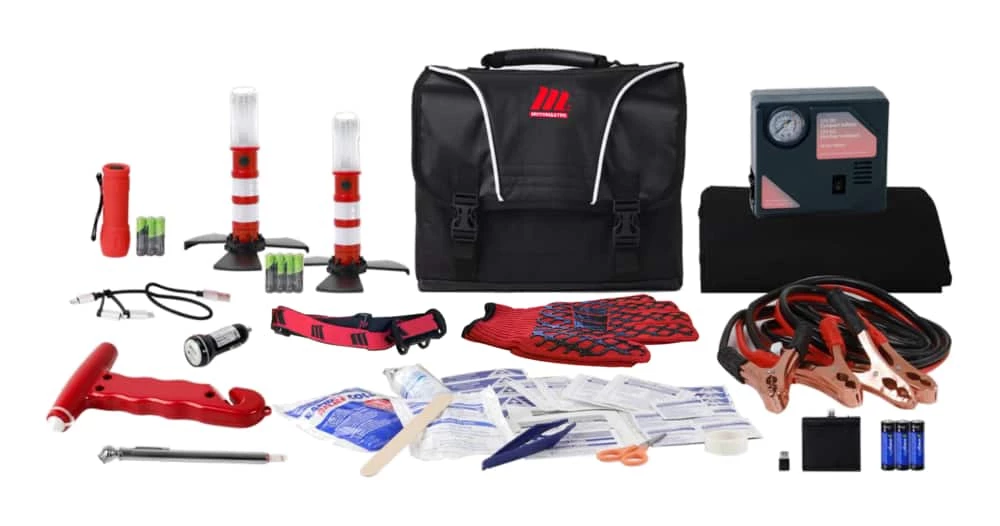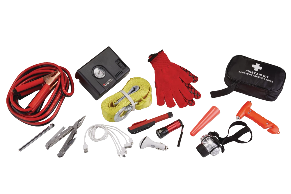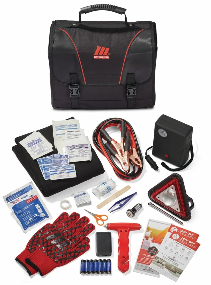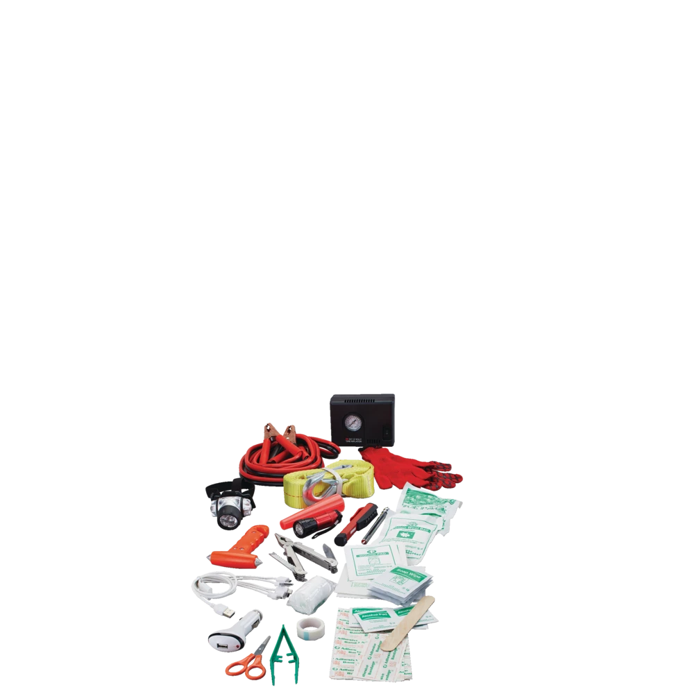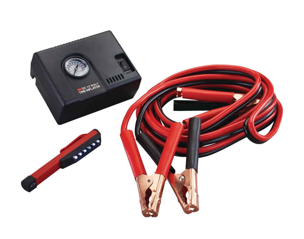 - Key components include premium booster cables, 7,500 lb tow strap, air compressor, glove box kit and headlamp