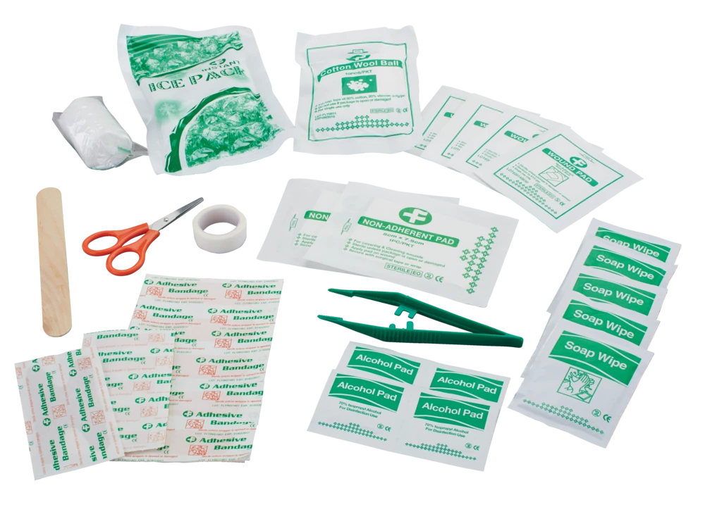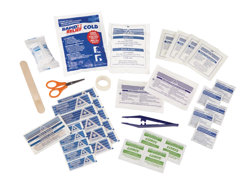 - Pieces Included: Bandages, Batteries, Emergency Blankets, First Aid Guide, Flashlights, Gauze Pads, Other, Ponchos