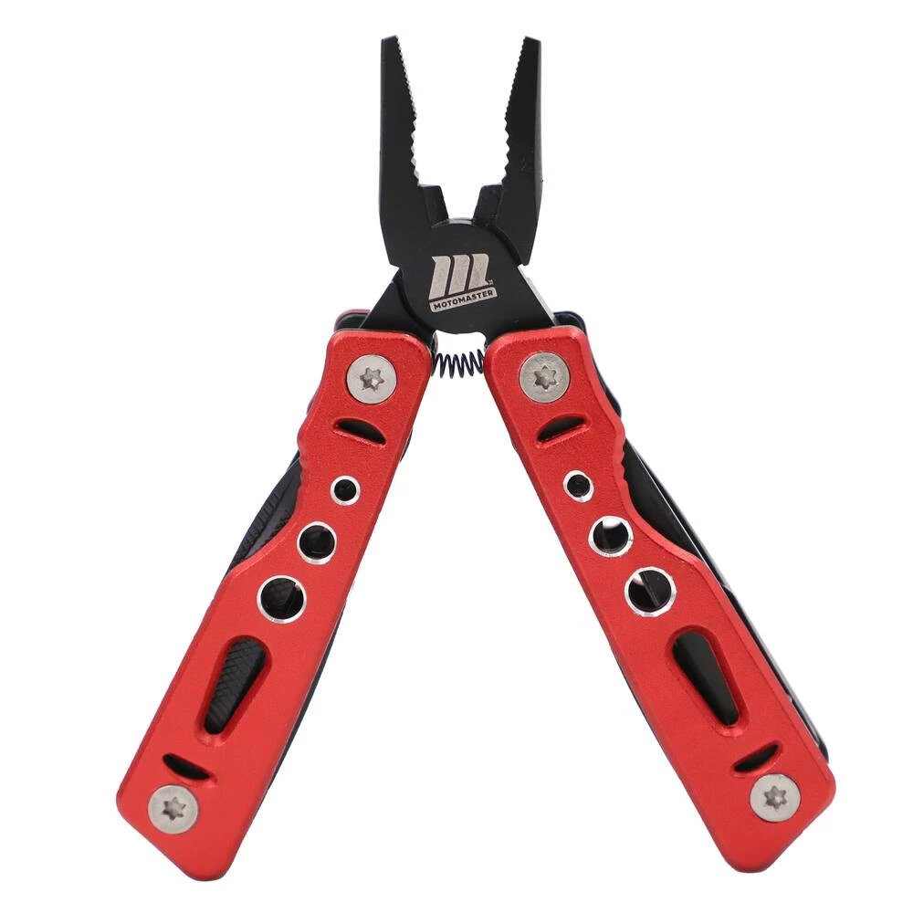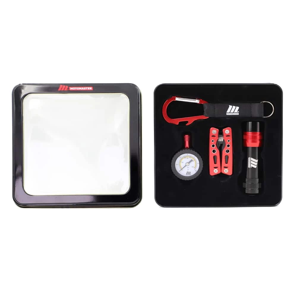 - Features a 12-in-1 multitool, rubber dial tire gauge, LED aluminum flashlight and a 3-in1 Carabiner