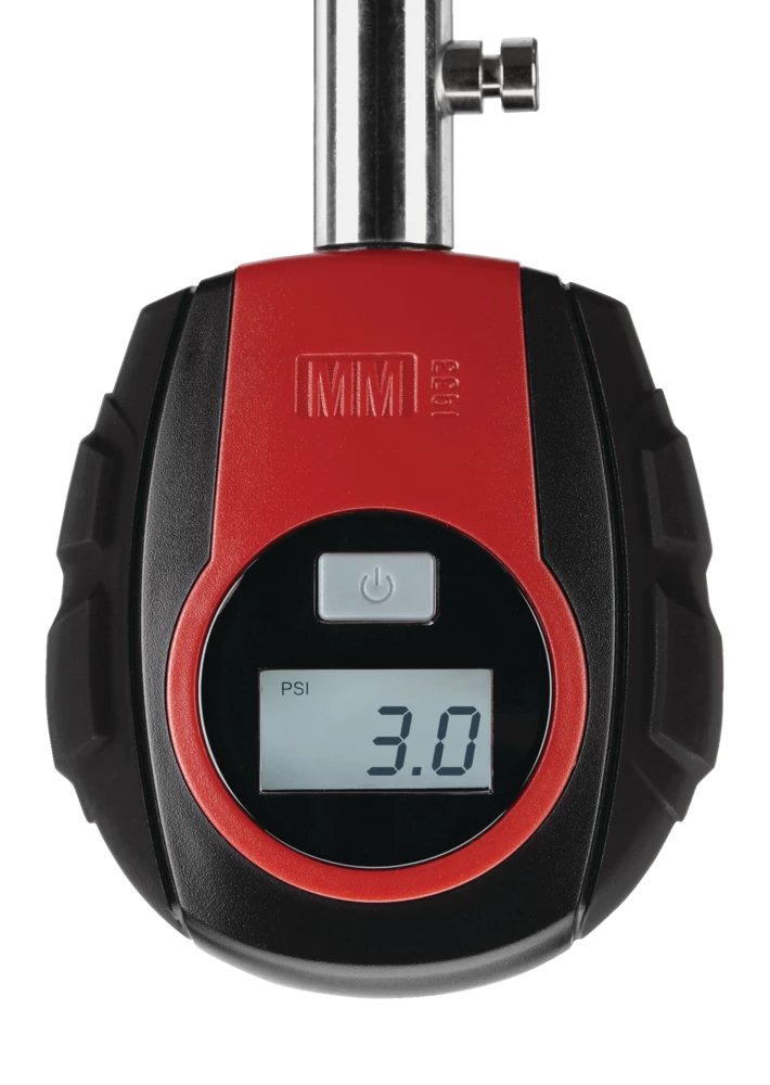 - MotoMaster Heavy Duty Digital Tire Gauge 5-120 PSI features a dual chuck with a flexible hose