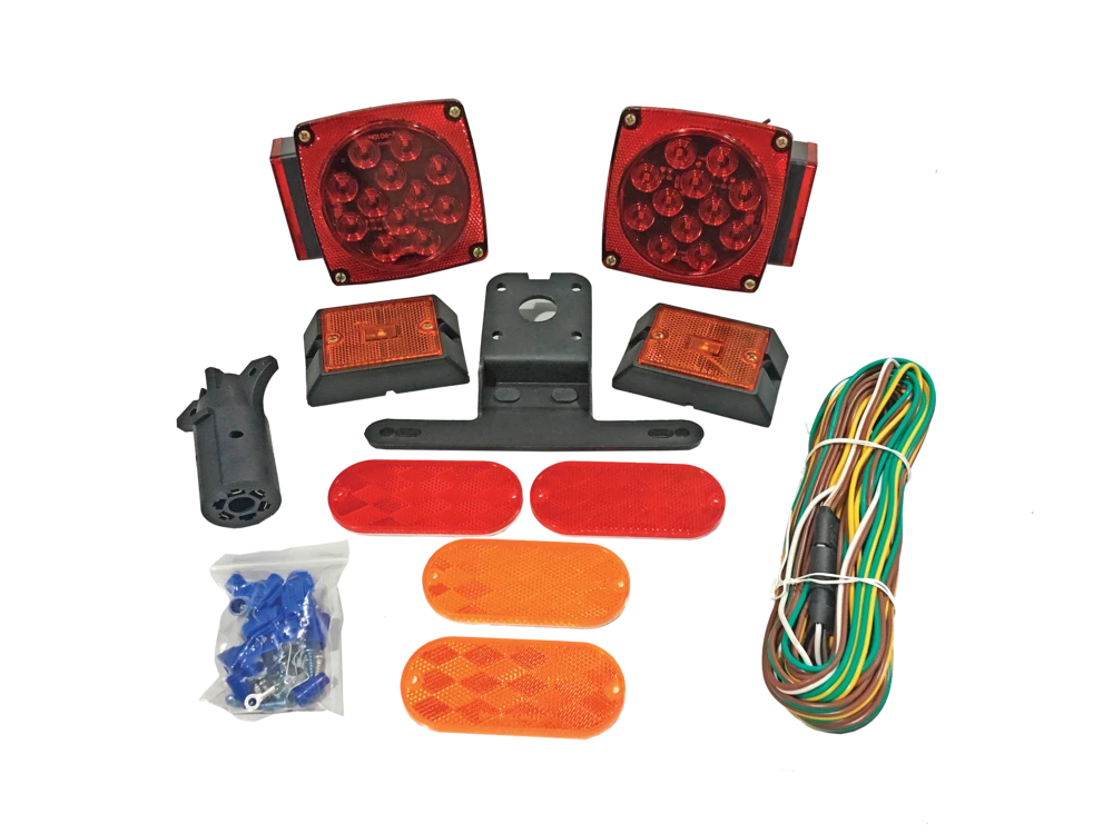 - Kit includes 2 tail lights, 2 side marker lights, 4 oval reflectors, 7-way RV blade to 4-wire flat adapter, wiring harness, license plate bracket and mounting hardware