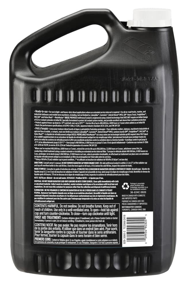 MotoMaster Extended Life Diesel Premixed Anti-Freeze/Coolant is designed for use in light and heavy-duty diesel applications where an extended service interval is required. Ideal for all on-road trucks, marine and industrial stationary and mobile farm equipment. Engineered using a hybrid technology that DOES NOT require an Initial charge of SCA or coolant extender at Initial fill. Specially formulated to protect all coolant system metals, and provide excellent wet sleeve liner cavitation protection.