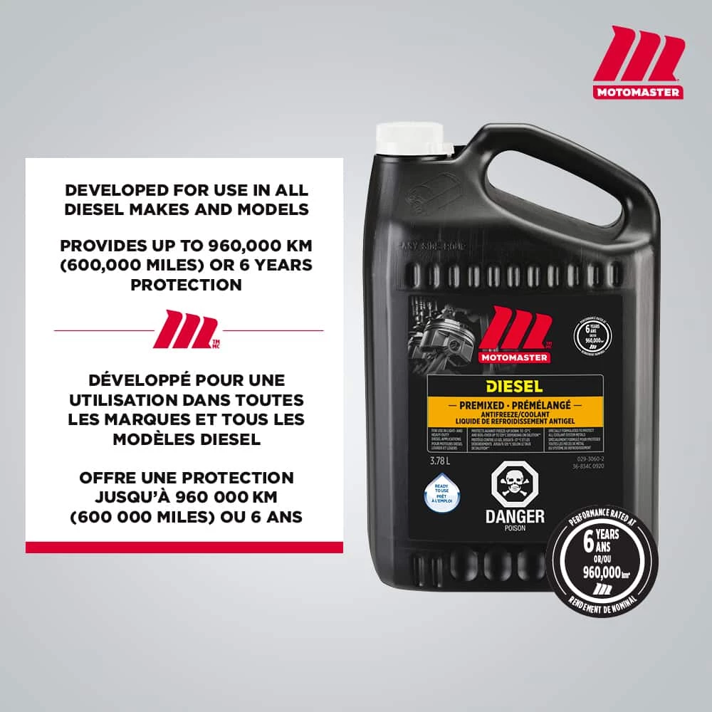 - MotoMaster Extended Life Diesel Premixed Anti-Freeze/Coolant is formulated for use in light and heavy-duty diesel applications where an extended service interval is required