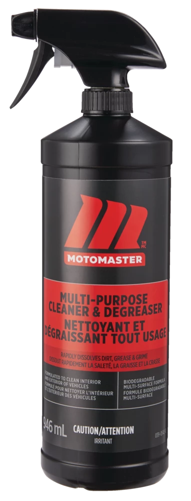 - MotoMaster All Purpose Cleaner and Degreaser dissolves grease and grime quickly and efficiently in the car, garage, or at home