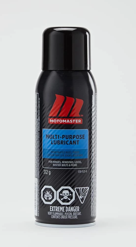 - Motomaster Multi-Purpose Lube lubricates door hinges, windows, locks to help stop squeaks