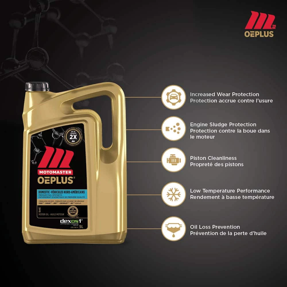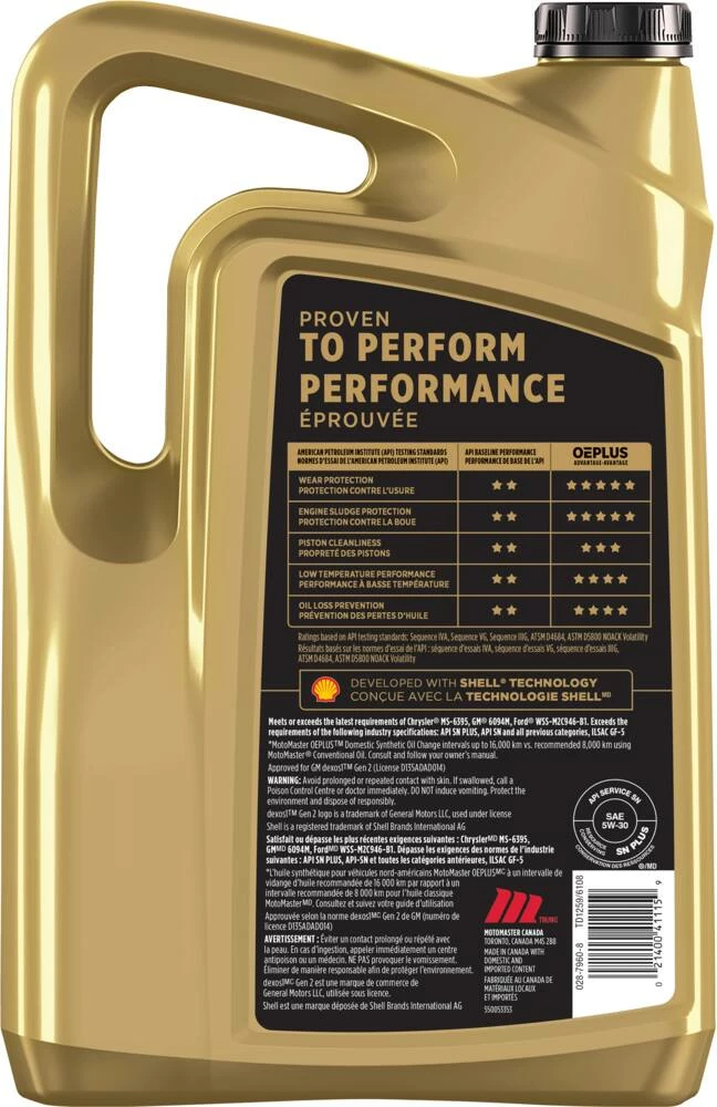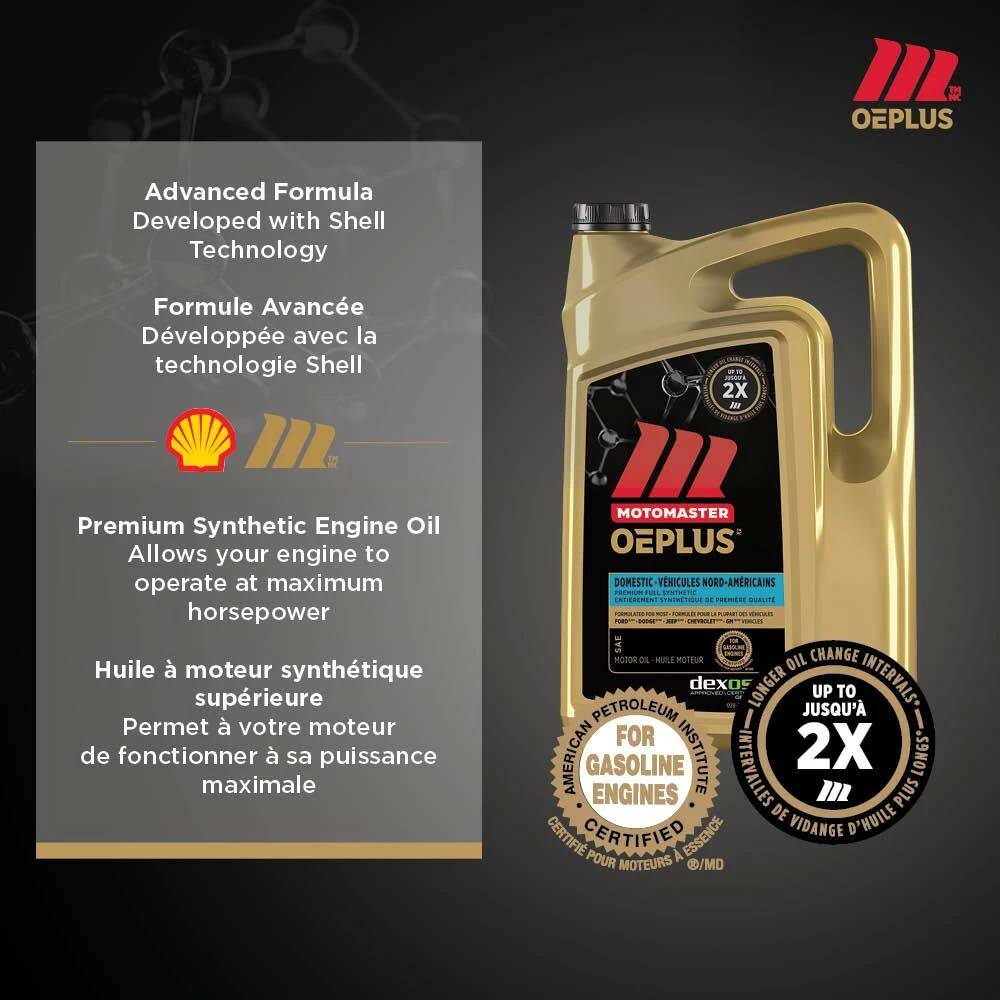 MotoMaster OEPlus Domestic Engine Premium Synthetic Engine Oil developed with Shell Technology is a new and formulation that is engineered to provide complete engine protection and piston cleanliness, outperform the latest API specifications by delivering superior protection in all weather conditions for North American vehicles.