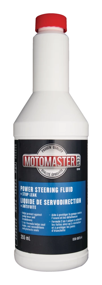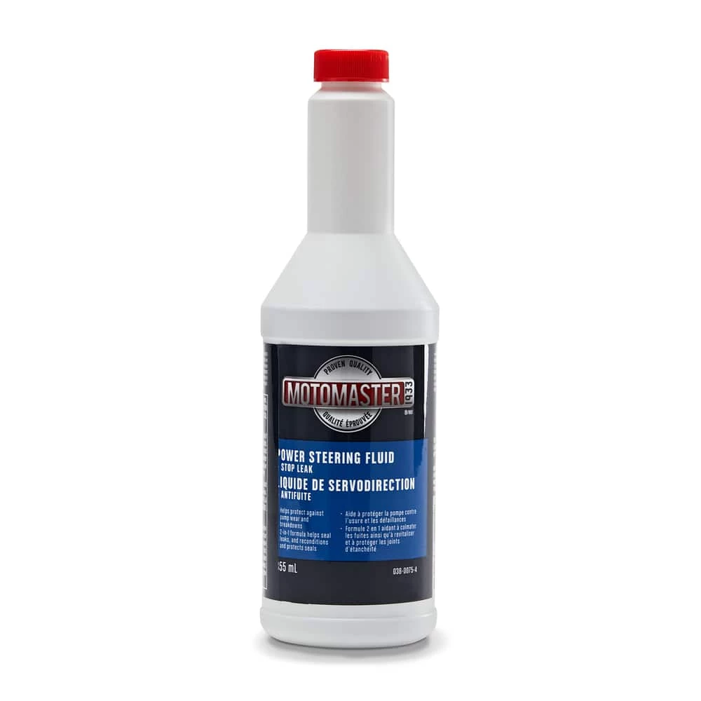 - MotoMaster Power Steering Fluid + Stop Leak helps seal leaks in the power steering system