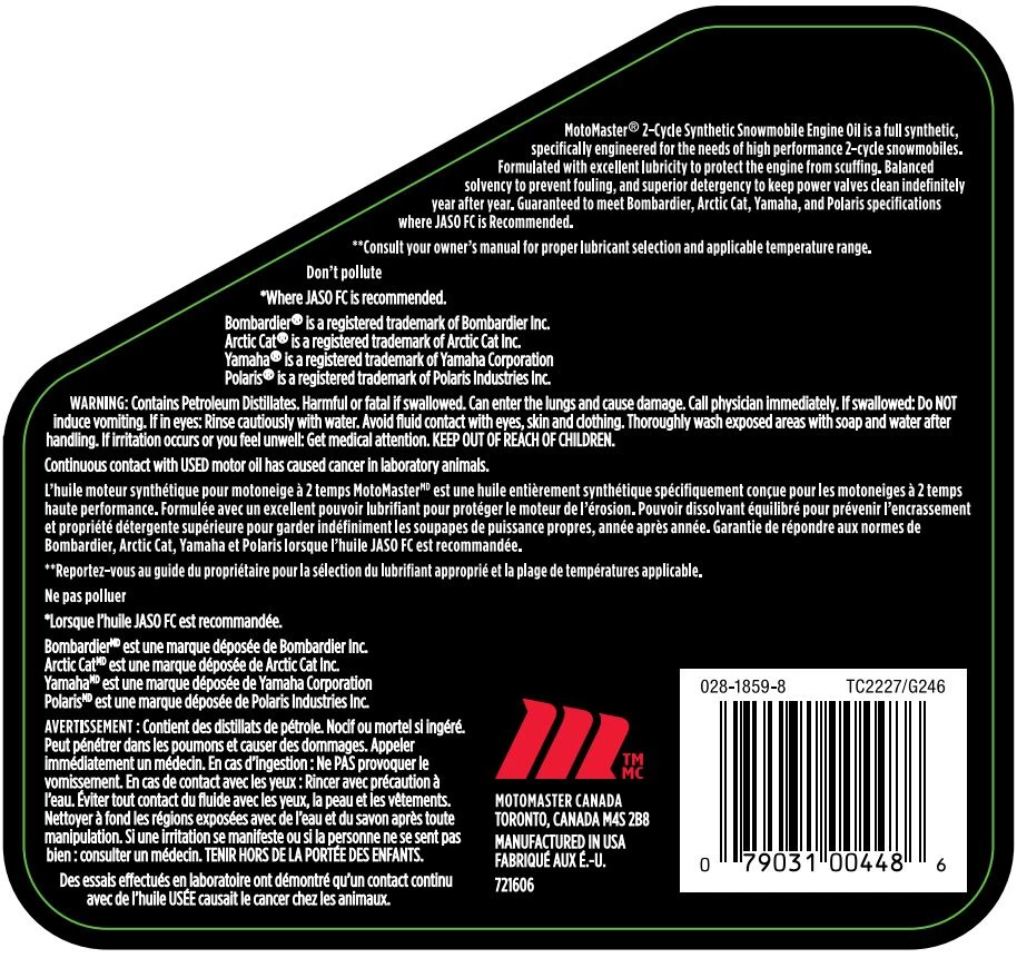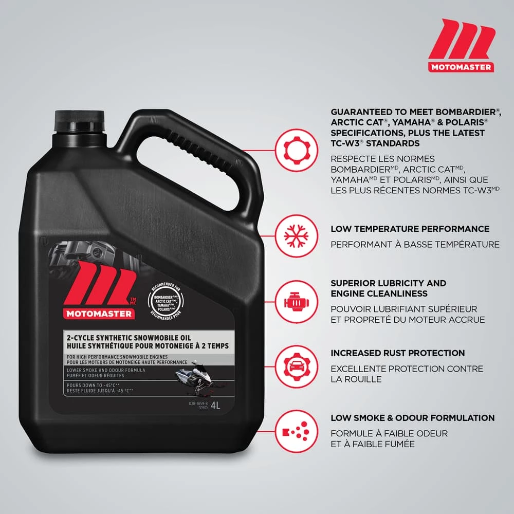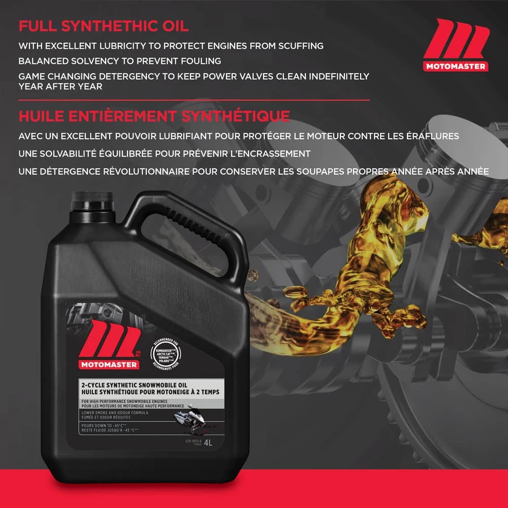 - MotoMaster Synthetic 2-Stroke Snowmobile Oil is a full synthetic, reduced smoke engine oil specifically engineered for the needs of high performance 2-cycle snowmobiles